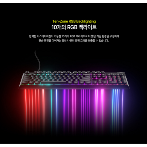 그리고 이 키보드는 105키 배열로 되어 있어서 기본적인 사용에 불편함이 없어요. 저처럼 무선 제품보다 유선 제품을 선호하는 분들께 아주 적합하죠. 또한 체리 MX 스위치와 유사한 느낌의 멤브레인 방식으로 되어 있어 타격감도 좋았어요! 가벼운 터치감과 묵직한 반응성이 조화를 이루니 아주 만족스러웠답니다.